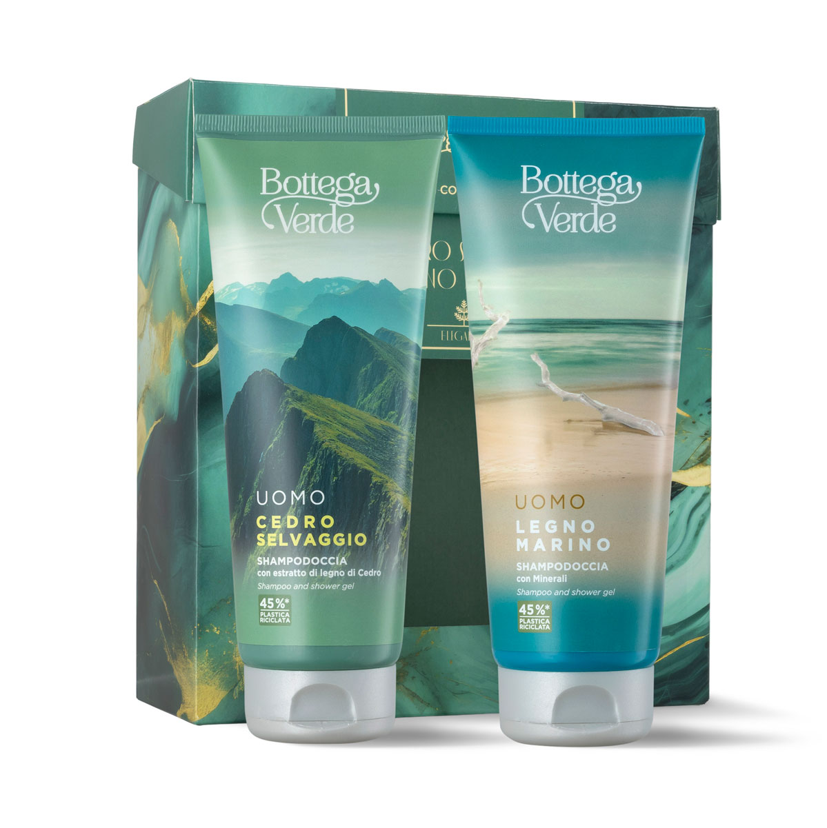 “Darilni paket vsebuje: [1] Divja cedra – 2 v 1 prhanje in šampon 200ML [2] Moški – Morski les – 2 v 1 prhanje in šampon 200ML.